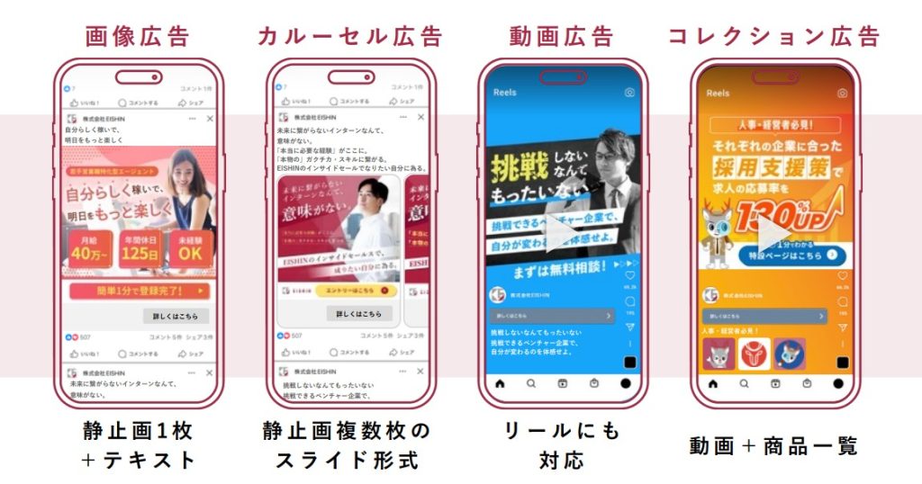 Meta広告では、次のような形式のクリエイティブが利用可能です。