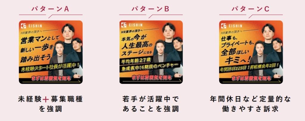 EISHINでは、採用領域のノウハウを持ったクリエイターが、採用目的に最適化したクリエイティブを制作します。