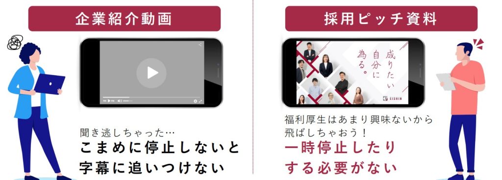 そのため、パケットを多く使用する動画や、「ながら視聴」がしにくいスマホでわざわざ採用サイトに遷移させるより、採用ピッチ資料は手軽に情報収集の手段として活用できるため、離脱が起こりにくいのです。
